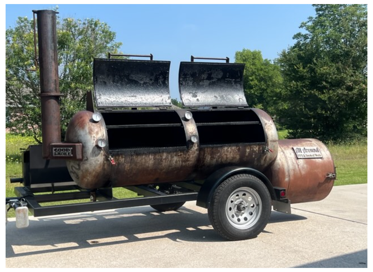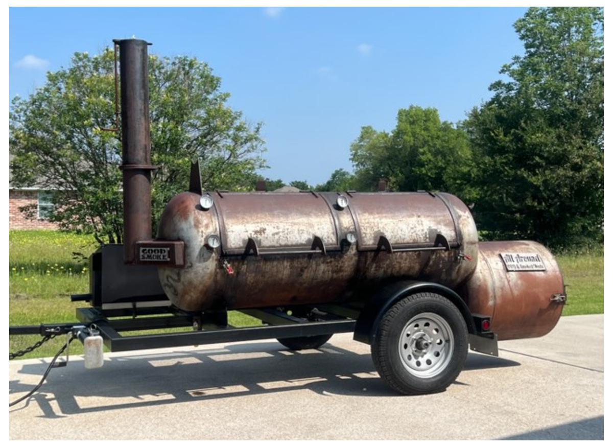 Description: 250 gal offset smoker. Top slide out grates. Bottom long grate. Teltru thermometers. Firewood basket. 3 basket fryer.